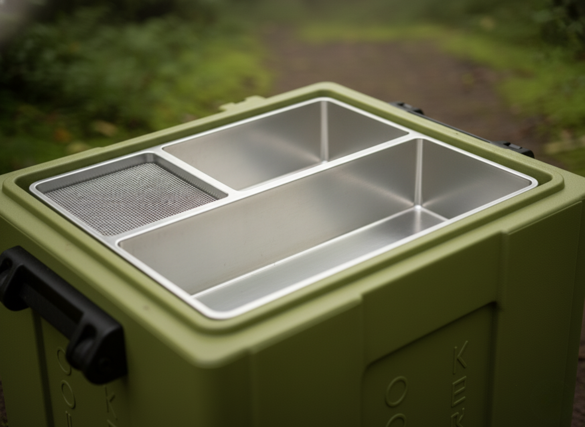 - Designed so ice can be poured into the top of the kennel; it flows around the aluminum box to surround the dog in cooling air.
