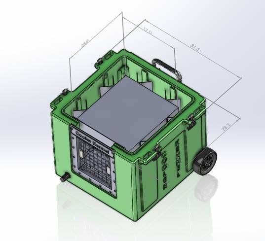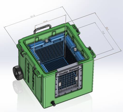 - Ice can be poured into the top of the kennel; flows around the aluminum box to surround the dog in cooling air.