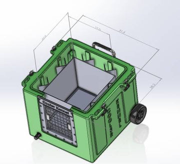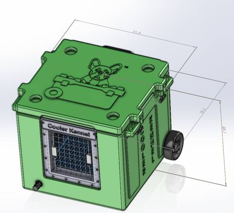 - Designed so ice can be poured into the top of the kennel; it flows around the aluminum box to surround the dog in cooling air.